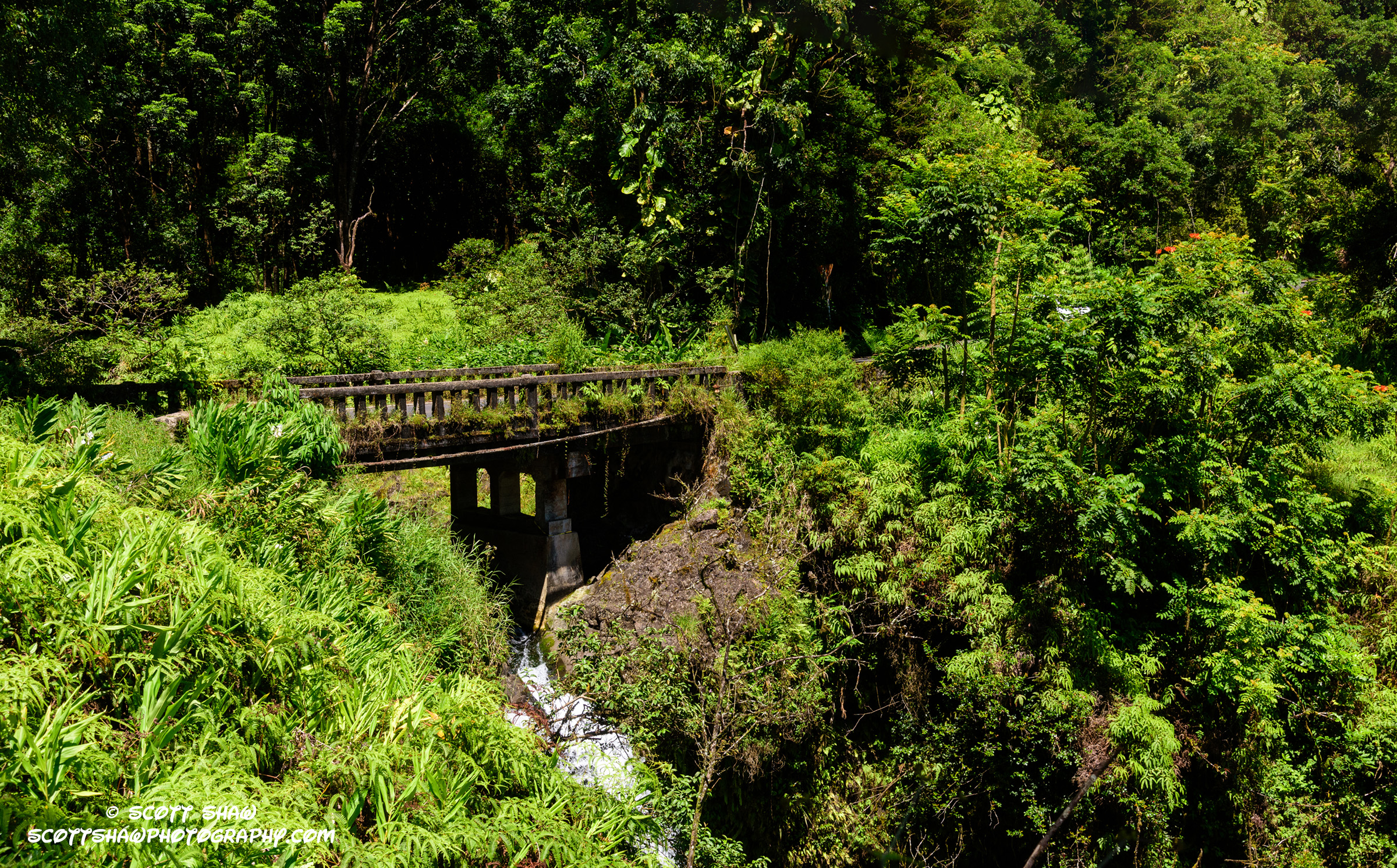 This Hana Highway bridge looks like something out of an Indiana Jones movie. While it might look generally overgrown and decrepit, it is perfectly safe to cross. There are many such bridges on the Hana Highway, but this is one of the few with a nearby parking spot, and an opening in the vegetation that allows for such a composition. The vegetation on the far side of the bridge precludes one from capturing a similar image from that side.