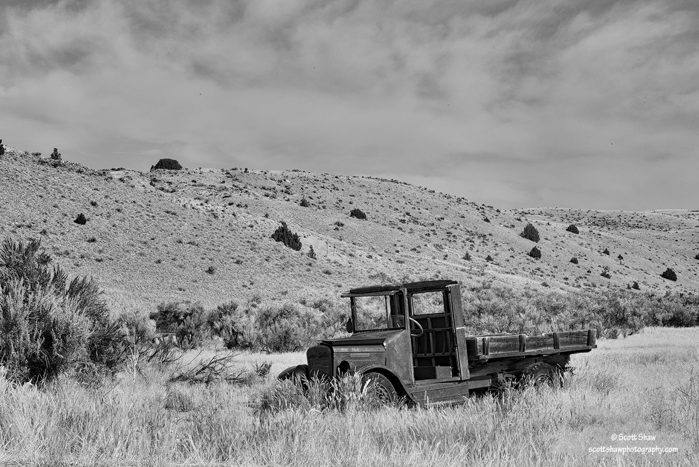 Black and white photograph of an abandoned truck at Montana’s Bannack State Park
